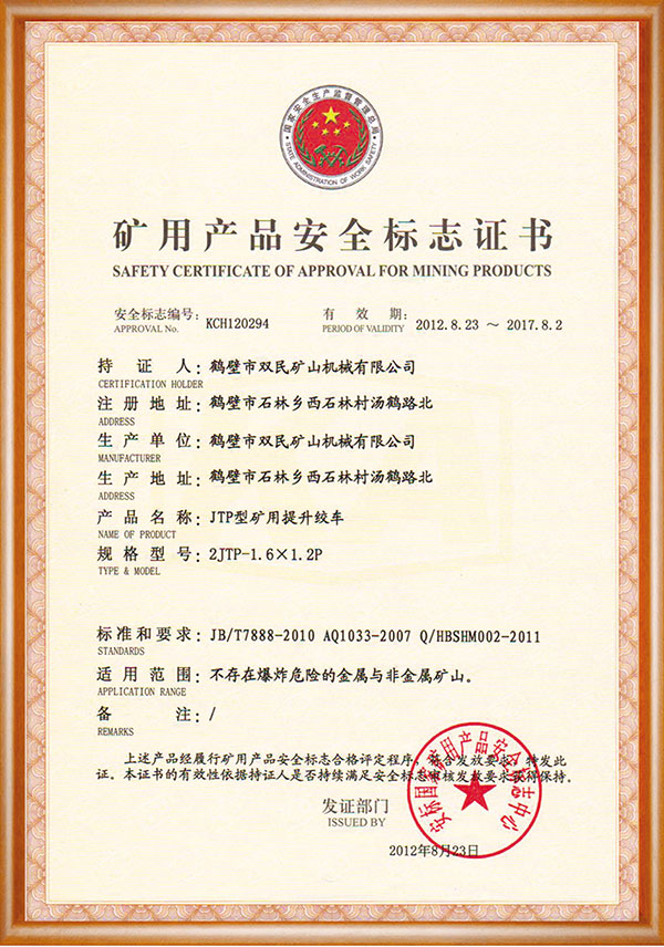 礦用產(chǎn)品安全標(biāo)志證書(shū)